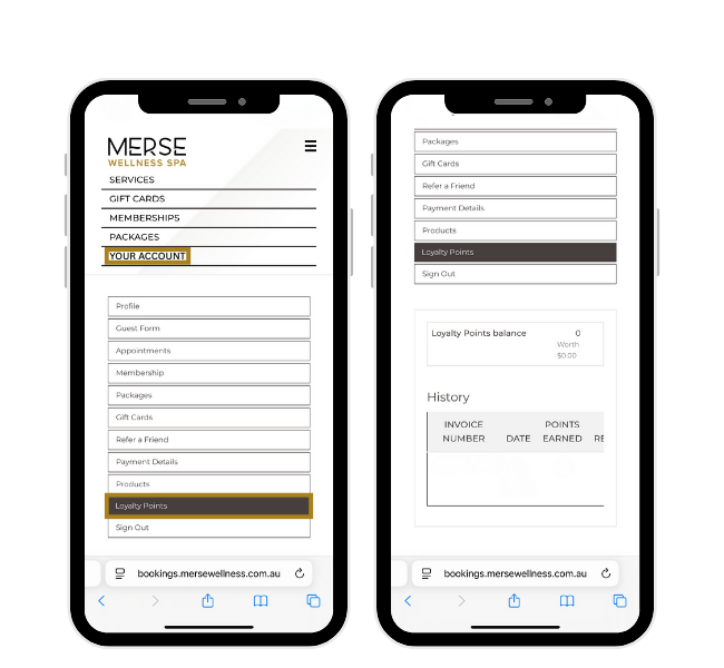 A:At the moment, points can only be redeemed in person by letting our team know when you arrive for your experience. You can check your balance anytime in the Merse Wellness Spa app under the Loyalty section.