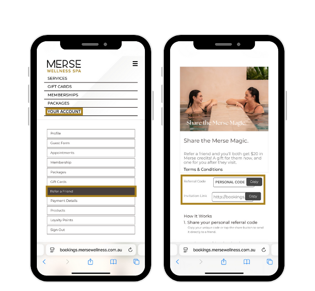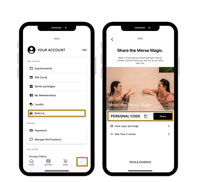 A: Refer a friend to Merse Wellness Spa by sharing your unique referral code, found in the Account then Referral tabs of the app. When your friend books their first visit using your unique code, they’ll receive $20 to use. After they visit, you’ll receive $20 in Merse Rewards credit (equal to 400 loyalty points) as a thank you.